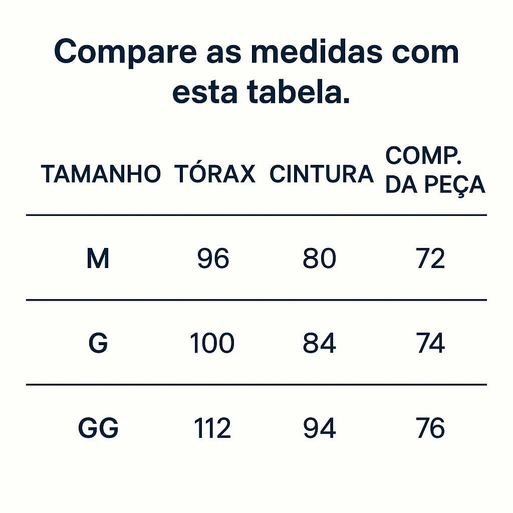 Costura: Reforço de ombro a ombro, sustentação e caimento perfeitos